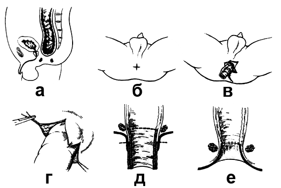 Рис. 14-73. Этапы промежностной проктопластики по Диффенбаху в модификации Лёнюшкина.