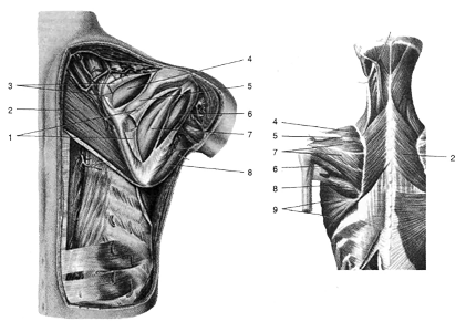 Рис. 2-20. Подостная и надостная фасции (а) и второй слой мышц лопаточной области (б).