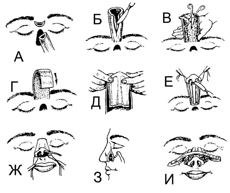 г — подшивание кожных лоскутов к стенке низведённой кишки,